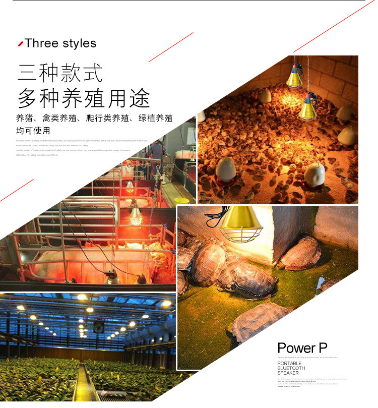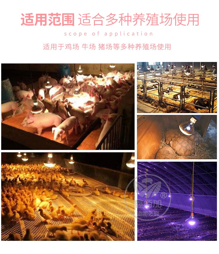 红外线加热灯:这种加热灯采用离子技术产生类似太阳的热辐射,可为饲养动物创造理想的条件。在养猪业中,红外线将电转化为热能,热辐射直接作用干仔猪的身体,减少热浪费,帮助仔猪生长和抵抗疾病,加热温度可以通过调节灯的县挂高度来调节,配合保温箱使用.加热效果更佳。