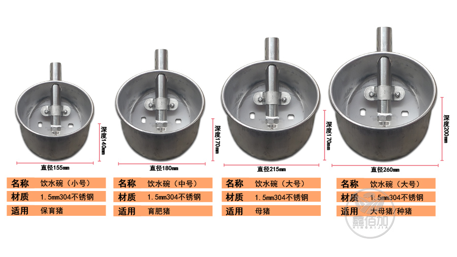参数:猪用饮水碗主体采用约1.5mm(实厚1.35)纯304不锈钢,水管、水咀等采用201不锈钢。圆形设计,分为4种规格:直径约155mm、180mm、215mm、260mm。适合不同时间猪使用。