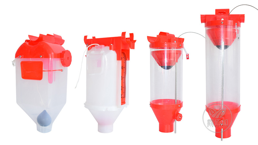 两侧旋钮式设计,旋钮上设置有刻度,可以观察和对桶内容量进行设置。桶体采用透明设计,可以观察桶内饲料情况,以免饲料堵住。