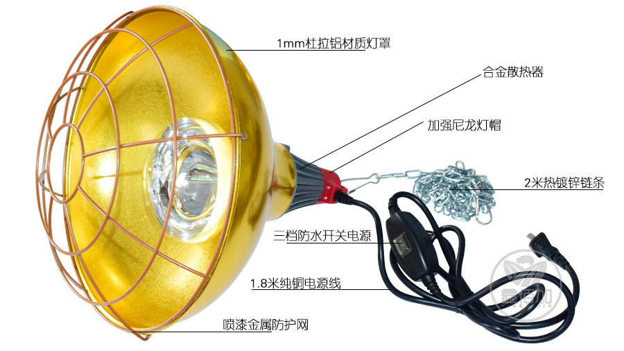 在原有小号的基础上增加了灯罩的直径,达到300mm,增加了整体的辐射面积,适合一些家庭养殖大面积取暖使用;