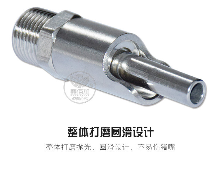 猪用乳头式饮水嘴工作原理:饮水时,猪嘴顶推阀杆,使之向上顶起钢球,水由钢球和猪水嘴体之间的缝隙流出,供猪饮用。猪饮毕后钢球和阀杆靠自重复位,同时在水压作用下严密封闭水流出口。