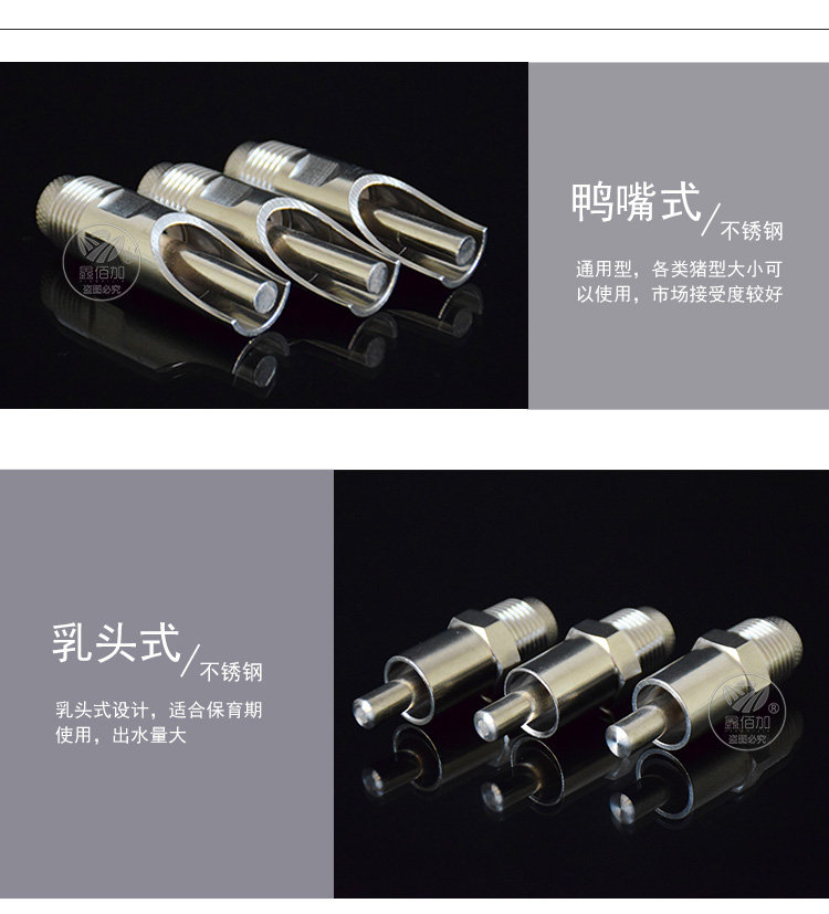 猪自动饮水嘴安装高度是多少:安装乳头式饮水器时,一般应使其与地面成45°-75°倾角,离地高度,仔猪为25cm,生长猪(3-6月龄)为50cm~,成年猪75cm
