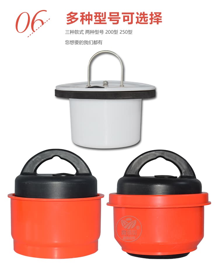 碗式粪塞200型, 材质:橘色外壳ABS,内胆PE;上直径210下直径190高120;重约900g/个;
