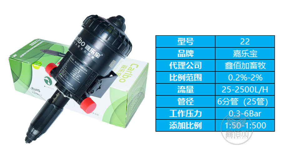 比例0.2-2%;流量约25-2500L;配6分(25管)管;工作压力约0.3-6bar;添加比例1:50-1:500;约2.2kg/套;490*200*160(1套/件),配套带前置过滤器;